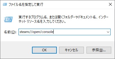 - WindowsキーとRキーを同時に押して実行ボックスを開き「steam://open/console」と入力し、Steamコンソールを起動。