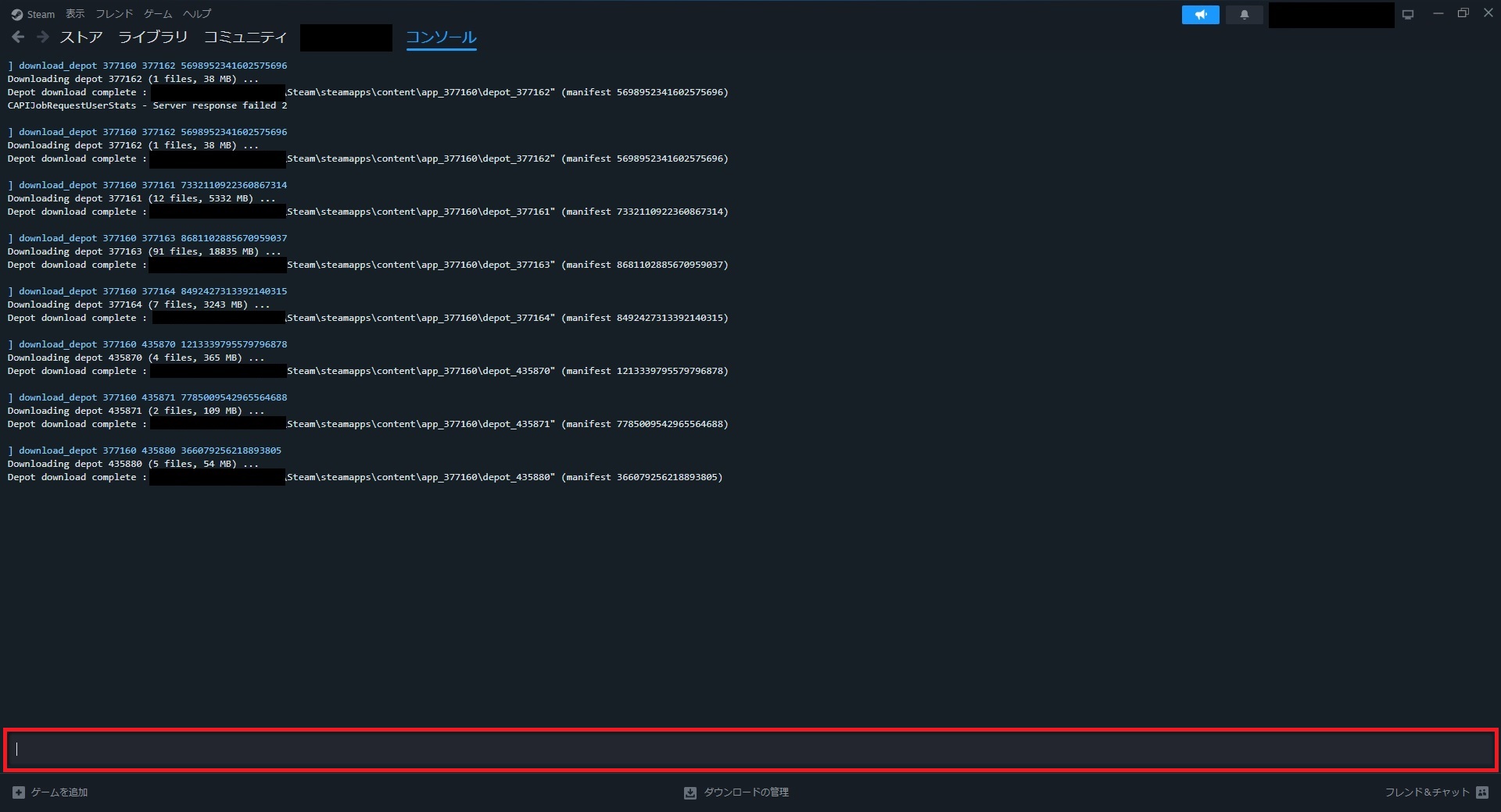 - Steamコンソールを開いたら、以下のコマンドを順番に打ち込む(時間が掛かる物もありますが、download completeと表示されるまで待ちましょう)。