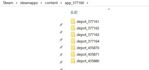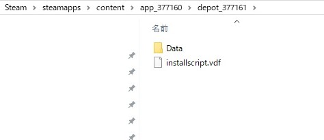 「steamapps/content/app_377160/」の直下に、こんな感じでダウンロードされたファイルが保存されています。