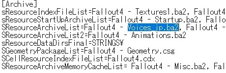 SResourceArchiveList=Fallout4 – Voices_jp.ba2, Fallout4 – Meshes.ba2, Fallout4 – MeshesExtra.ba2, Fallout4 – Misc.ba2, Fallout4 – Sounds.ba2, Fallout4 – Materials.ba2